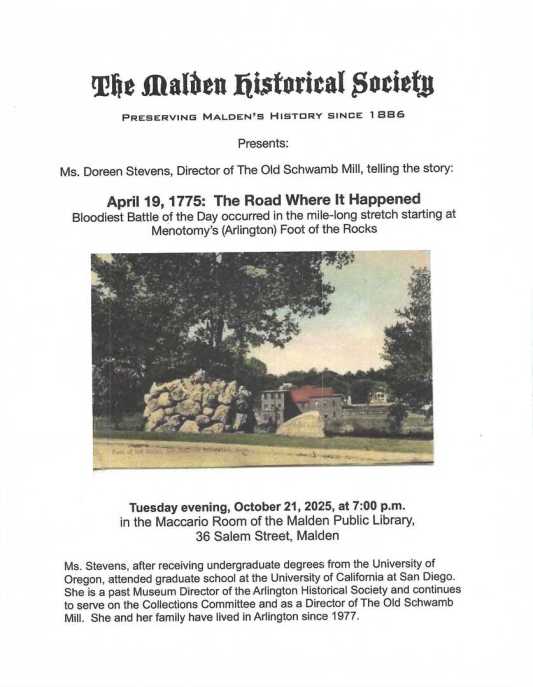 This talk is part of the Malden Historical Society’s ongoing efforts to celebrate and preserve our history. We’re proud to commemorate Malden’s 375th anniversary this year!